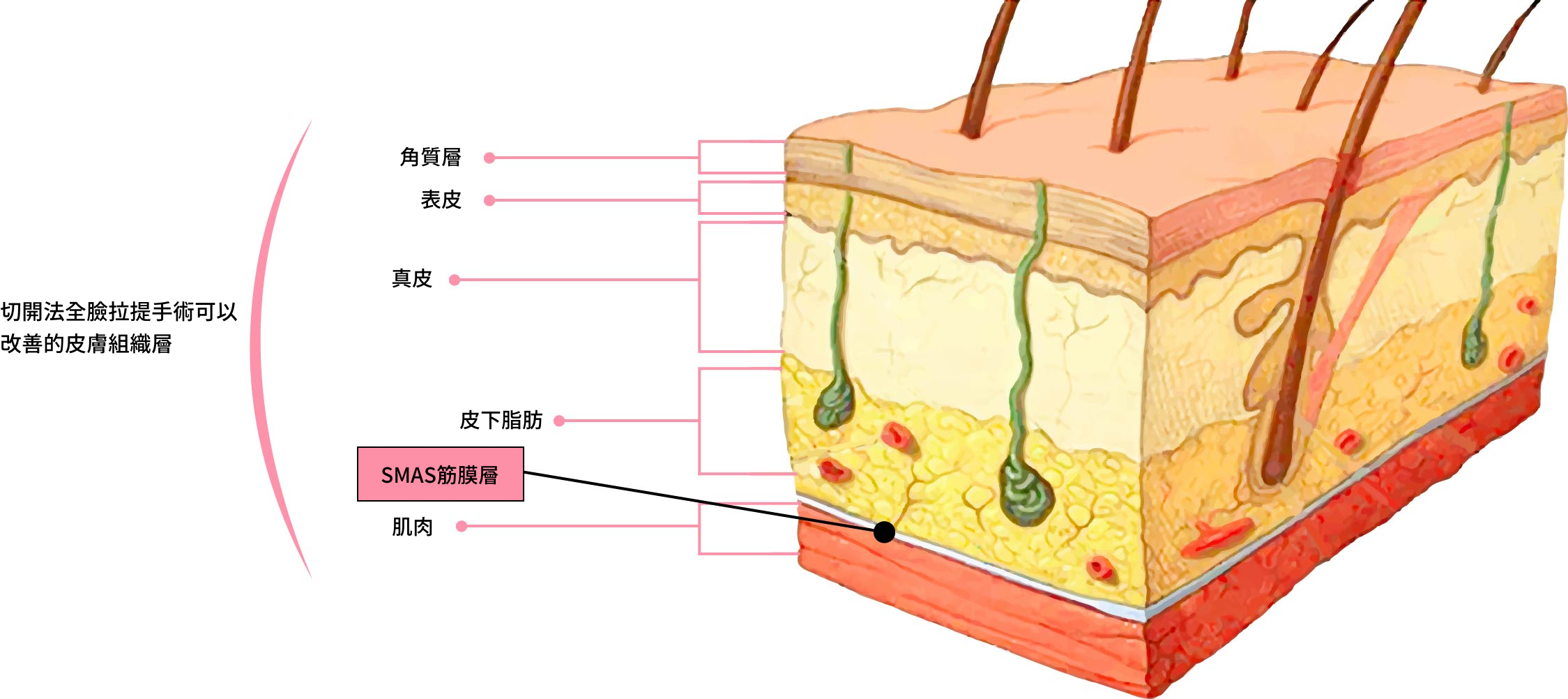 SMAS筋膜層位於皮下脂肪與肌肉之間,是強韌的結締組織,能夠支撐皮膚、肌肉及骨骼輪廓,並將臉部肌肉運動傳遞到皮膚上。隨著年紀增長及地心吸力的長期影響,SMAS筋膜層會連同其他皮下組織一起出現下垂、老化現象。因此如果只有進行肌膚表層的拉提,沒有同時拉提SMAS筋膜層的話,拉提效果不只不明顯,也維持不久。所以為達到更好的拉提效果,選擇包含SMAS筋膜層的拉提術是十分重要的。