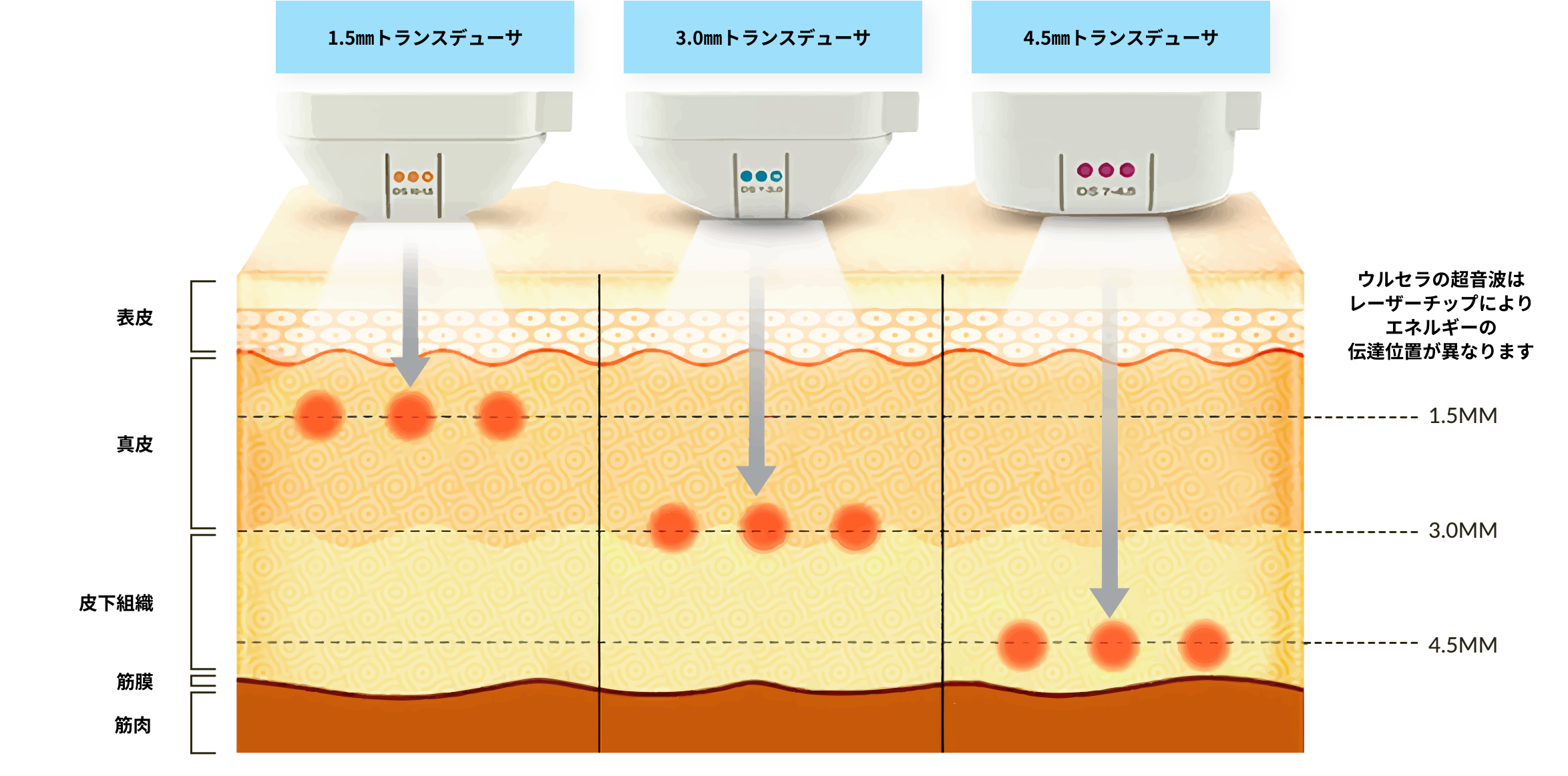 FDAおよびKFDAで承認を得た、非常に効果的な自然で非侵襲的なフェイスリフトです。ウルセラは、HIFU(高密度焦点式超音波)治療で、皮膚の下にある緩んだ組織や脂肪を熱で改善するものです。この簡単な治療で、手術をすることなく、皮膚を持ち上げ、引き締めることができます。たるみの原因になる部位を狙って、1.5mm、3mm、4.5mmと皮膚の深部を変えて引き上げます。