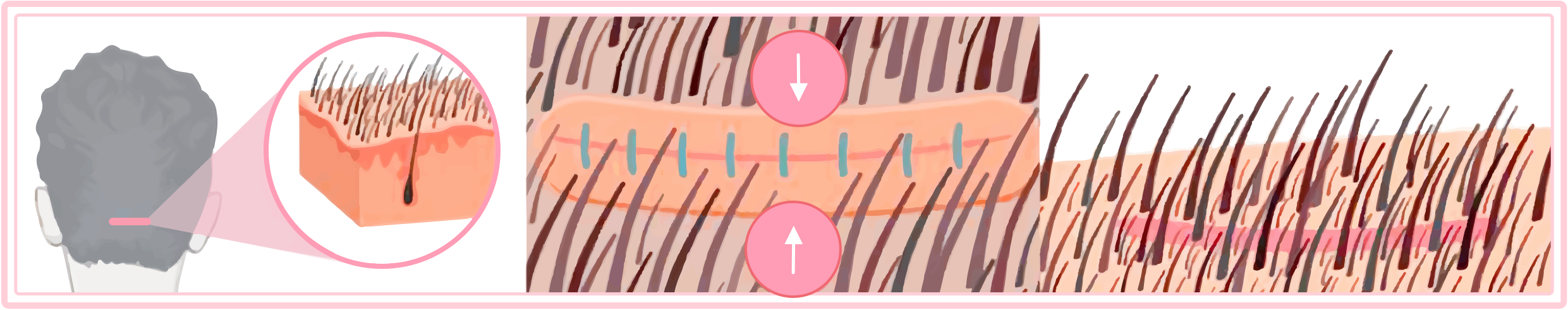 A thin incision will be made on the donor area. The benefit of this method is more precise surgery, provides the highest yield of hair, the incision will be concealed by the surrounding hair. It is recommended for those who like to keep the hair on the donor area at least around 2~3cm or longer to cover the incision.