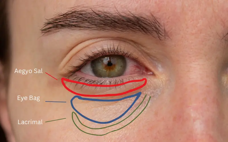Eyebags typically refer to the puffiness or swelling of the skin and underlying tissues beneath the lower eyelid. Eyebags protrude farther below the lower eyelid, creating a noticeable bulge or prominence that can give the eyes a tired, droopy, or aged appearance. Additionally, eyebags may be accompanied by dark circles or discoloration, further contributing to a tired or glum demeanor.
